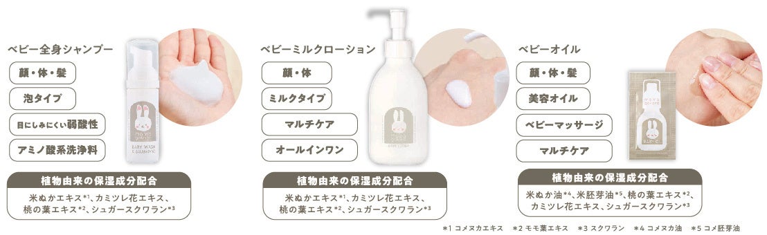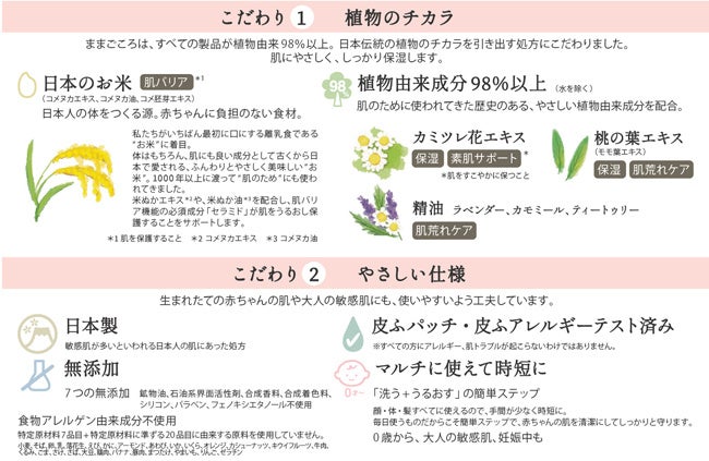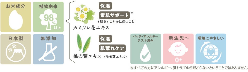 日本の伝統的な植物のチカラに着目し、お米成分(コメヌカエキス、コメヌカ油、コメ胚芽エキス)を配合した植物由来98%以上で、新生児から大人まで一緒にお使いいただけます。