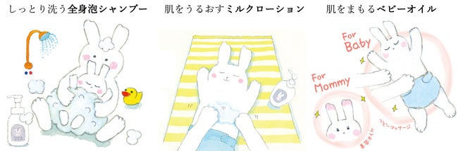 全身シャンプー(洗う)、ミルクローション(うるおす)、オイル(まもる)の3ステップのスキンケア。