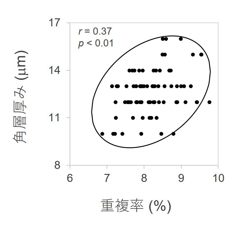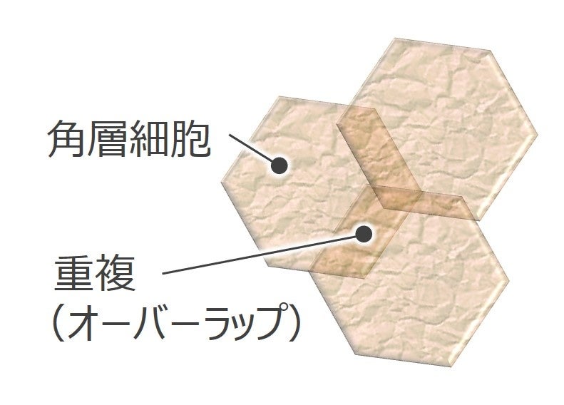 角層細胞が重複した部分は、細胞同士がDSG1などのたんぱく質で結合しており、これが分解酵素によって分解されることでターンオーバーが生じることがわかっているため、角層細胞の重複率と剥離性に因果関係があると考え研究を行った結果、重複率が低いと角層剥離がスムーズであることに比べ、重複率が高いとDSG1の分解が阻害され、角層剥離が起こりづらくなることがわかりました。この結果から、高齢者の角層は重複率が高いため、ターンオーバーしづらいことが判明しました。