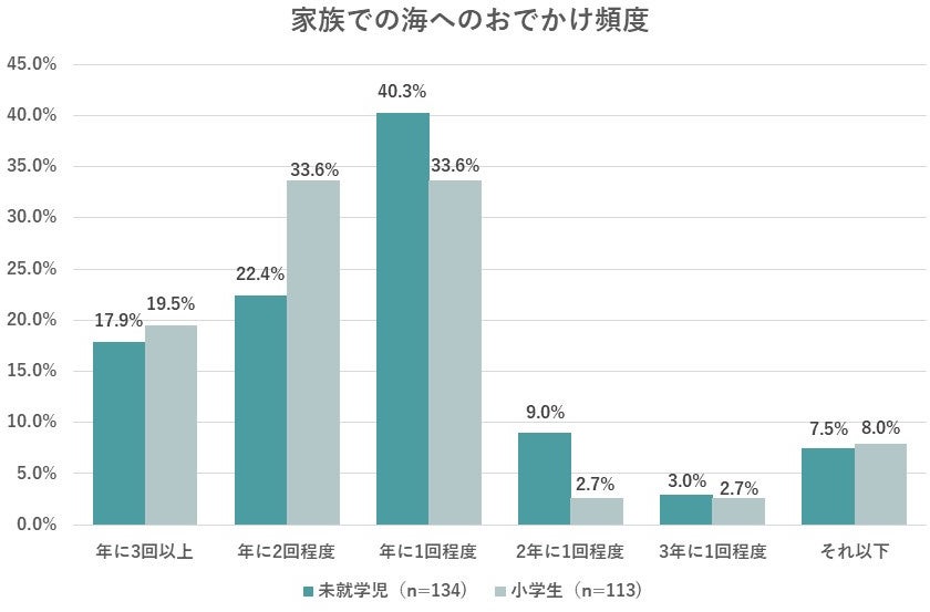- 海へのおでかけ頻度は子供の年齢問わず、大半が「年に1回以上」。さらに約2割は「年に3回以上」おでかけしている