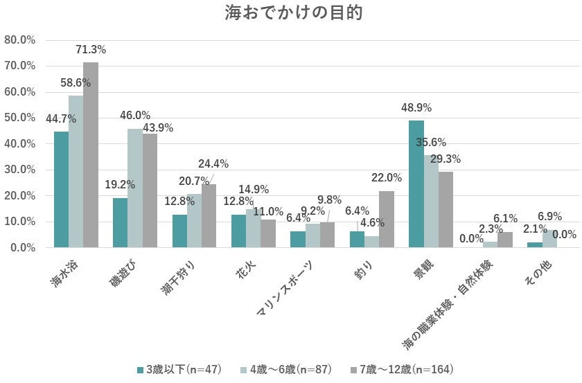- 海おでかけの目的は「海水浴」「磯遊び」「景観」が年齢問わず多数