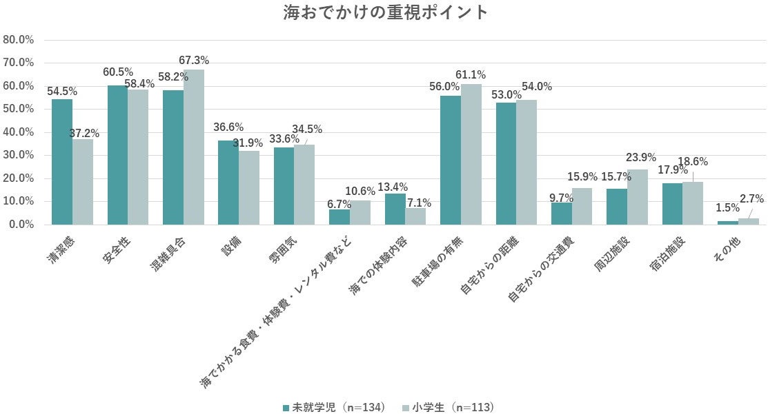 - 海を選ぶ際の重視ポイントは「混雑具合」「安全性」「駐車場の有無」「自宅からの距離」「清潔感」
