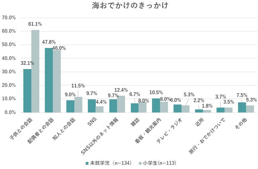 - 海に行ったきっかけは未就学児の場合「配偶者との会話」、小学生の場合「子供との会話」が最多