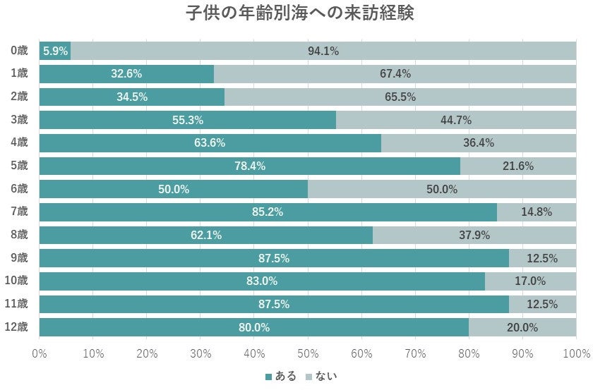 - 0歳は0.5割程度だが、1歳2歳で3割、3歳4歳で半数以上、5歳以上で8割程度は海へのおでかけ経験あり