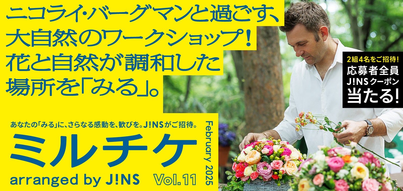 株式会社ジンズ(以下JINS)は、日常では体験できない特別な「みる(見る・観る・視る)」をチケットにして毎月抽選でご招待する「ミルチケ」(https://www.jins.com/jp/campaign/miruticket/)のVol.11として、ニコライ・バーグマンと過ごす、大自然のフラワーワークショップ!2月は花と自然が調和した唯一無二の場所を「みる」体験への応募受付を、2025年2月3日(月)より開始します。