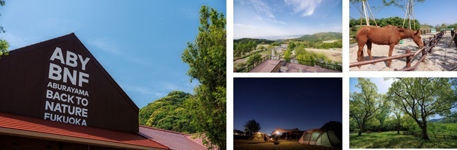 複合体験型アウトドア施設として、キャンプ場のほか、最大約200人が利用できるバーベキュー場、収穫体験を楽しめる農園と併設レストランなどが誕生。福岡都心部から車で約30分、市街地を一望できる場所で自然と触れ合えます。