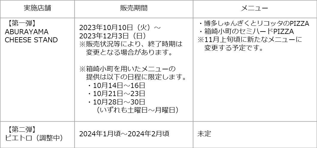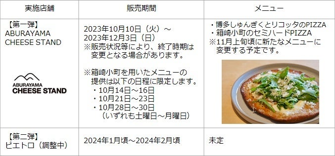第一弾は『ABURAYAMA FUKUOKA』にある『CHEESE STAND』において「博多しゅんぎく」や「箱崎小町(青ねぎ)」などを用いたメニュー提供を行います。なお、第二弾は『株式会社 ピエトロ』様と連携し、2024年1月頃実施する予定としております。