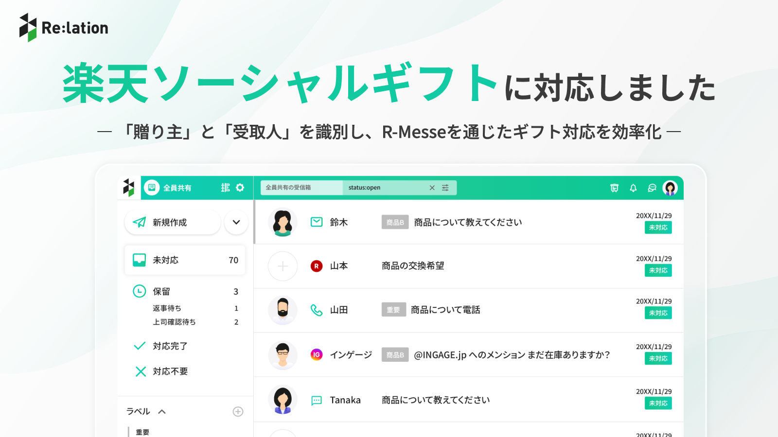 このたび『Re:lation』は、楽天市場の問い合わせ管理システム「R-Messe」との連携強化により、ソーシャルギフト特有の問い合わせを迅速に識別し、一元管理できる体制を整えました。