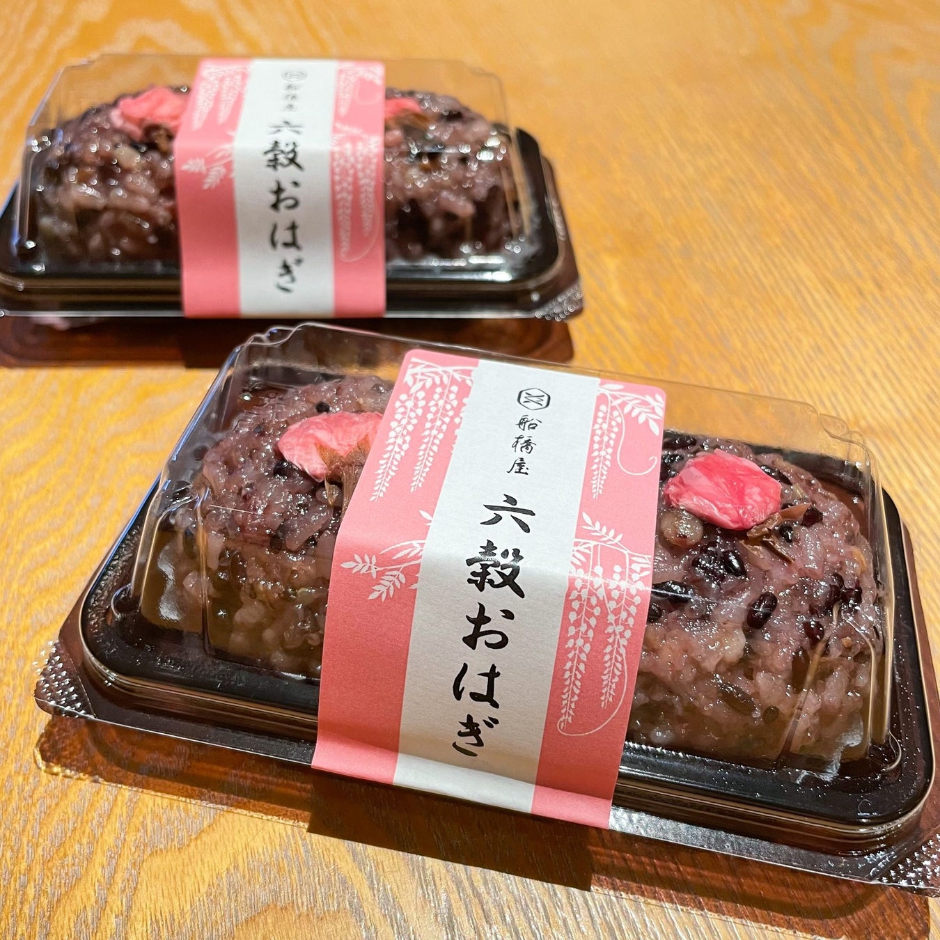 ほんのりとピンク色に染まった可愛らしいおはぎ。桜の香り豊かな六穀米入りのもち米で、船橋屋自家製のなめらかなこし餡を包みました。もち米ならではのもちもちとした食感と品の良い甘さのこし餡が、桜の甘塩っぱさを引き立てます。お供え物としてはもちろん、おはぎ好きな方にも食べていただきたい一品です。雑穀は黒米、大豆、押麦、いりごま、玄米、キヌアを使用。身体にも優しいので手土産にもおすすめです。