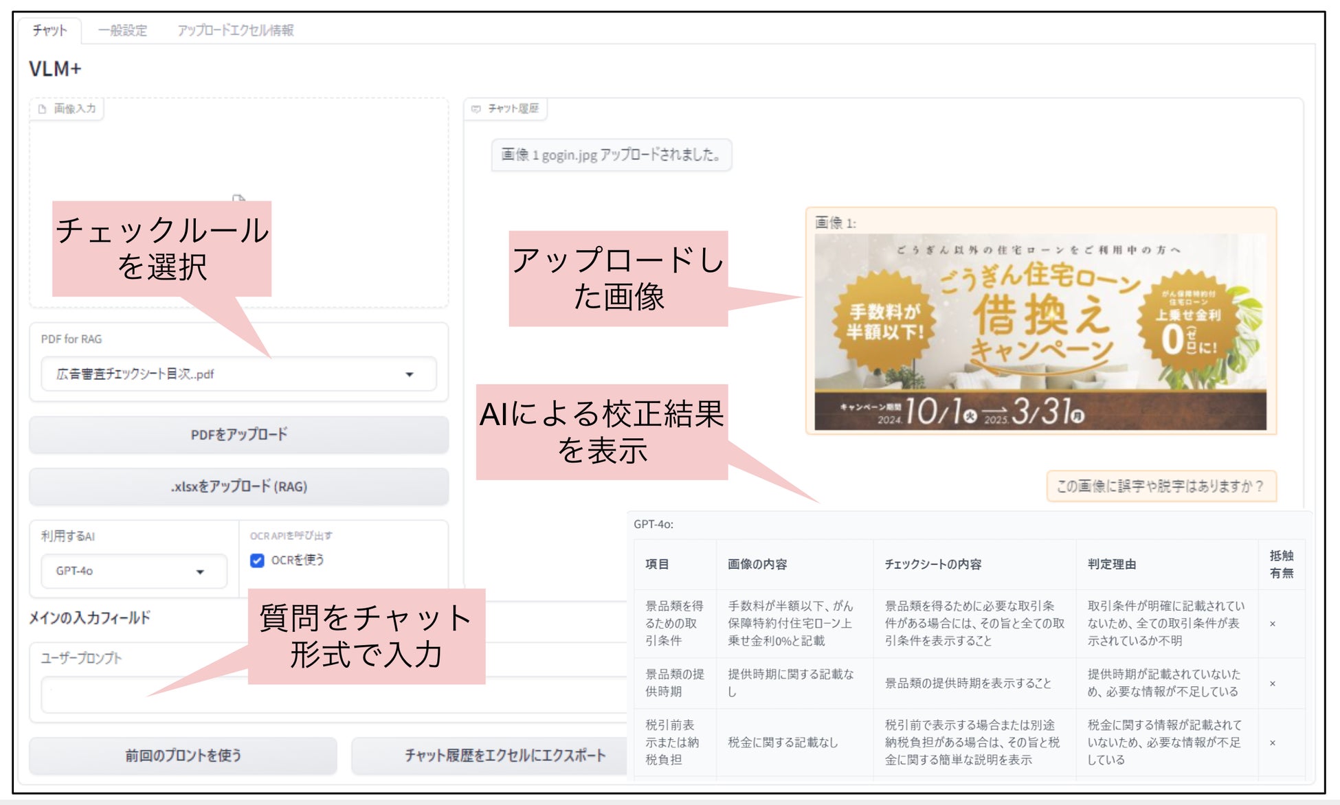 図 本システムの画面。左側の画面で画像を入力し、右側のチャット画面を利用して対話形式でやりとりできる。校正結果は一例で、10〜20程度の項目を指摘する