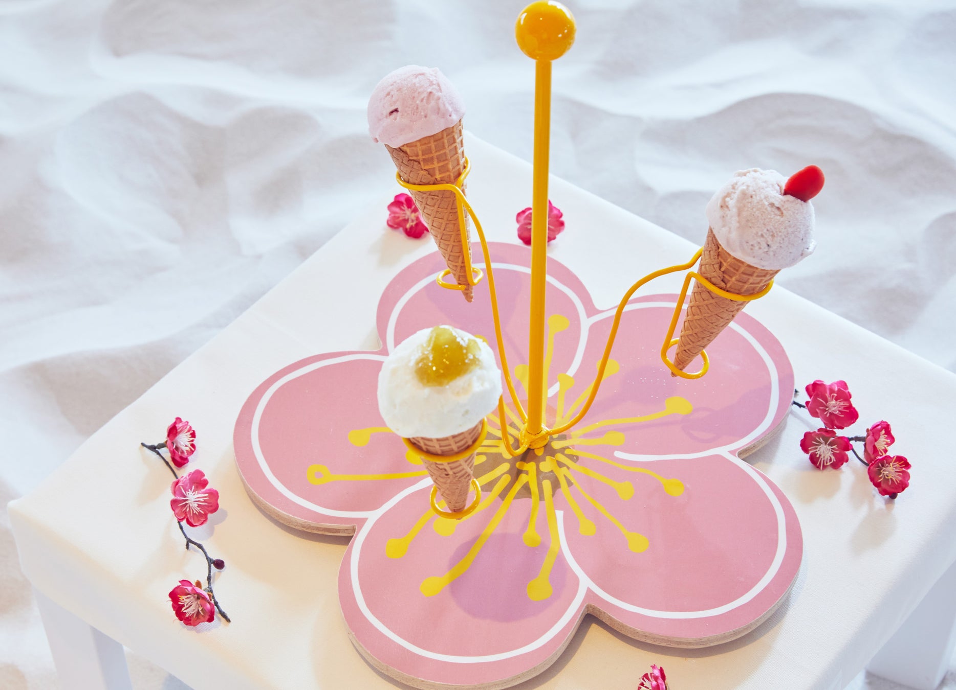 梅の果肉やジャム、ねり梅、カリカリ梅を使用した 3 種のジェラートを堪能できるプレートです。ジェラートの食べ比べを通して、それぞれの風味や食感の違いを楽しみながら、梅をとことん味わうことができます。プレートの土台は梅の花、スタンド部分はめしべをモチーフとした可愛らしい見た目に思わずわくわくします。
