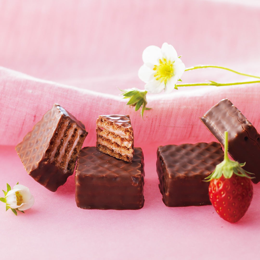 サクサクとした軽い食感のウエハースを4層に重ね、やさしい甘さのいちごクリームをサンド。仕上げにまろやかなミルクチョコレートでコーティングしました。