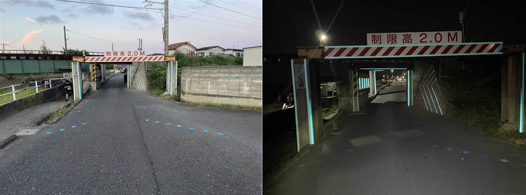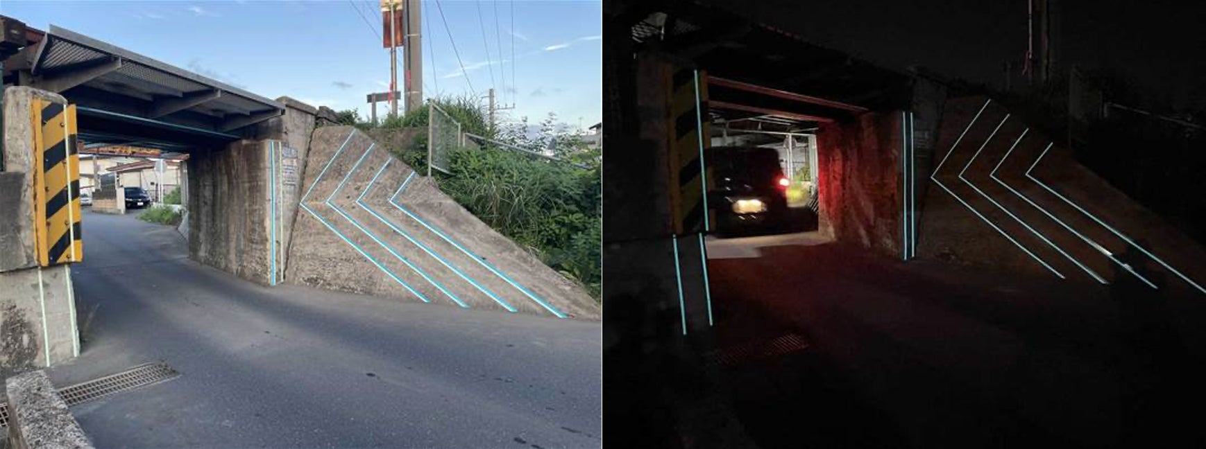 実証現場付近の市道は、昼夜ともに交通量が多く、鉄道橋の下を通過する際には1車線へと狭まるため、高輝度蓄光ユニットと反射材素材とのハイブリット施工により、昼間と夜間、またヘッドライト点灯時の全てにおいて、狭まる道、迫る空頭を視覚的に演出。無理な通過を抑止するようドライバーへの注意喚起を行い、衝突事故防止や減速、安全運転の促進を目指します。