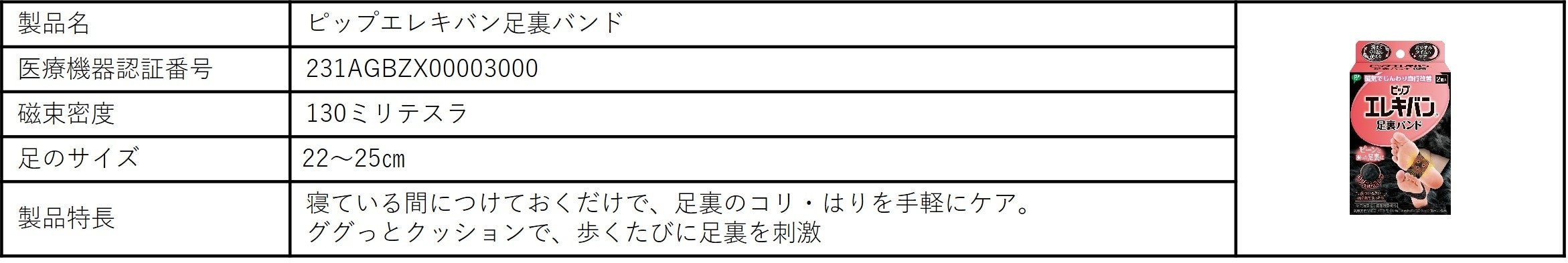ピンポイントでコリを解消する「ピップエレキバン」。磁気が体内成分に働きかけ血行を良くし、コリの原因となる老廃物を流します。貼っている間中効果が続くので、2~5日間貼ることを推奨します。そのままお風呂にも入れます。磁力の強さを選べるため、コリの状態によって使い分けが可能。こっているな、と思うところを指で軽く押さえ「少し痛い、気持ちいい」と感じるところに貼ったり、必要に応じてその周囲にご使用ください。その他、着けるだけで足裏のコリ・はりを手軽にケアする「ピップエレキバン足裏バンド」や、背中まで広がったしつこい肩コリにアプローチする「ピップエレキバンインナークリップ」もご用意しています。