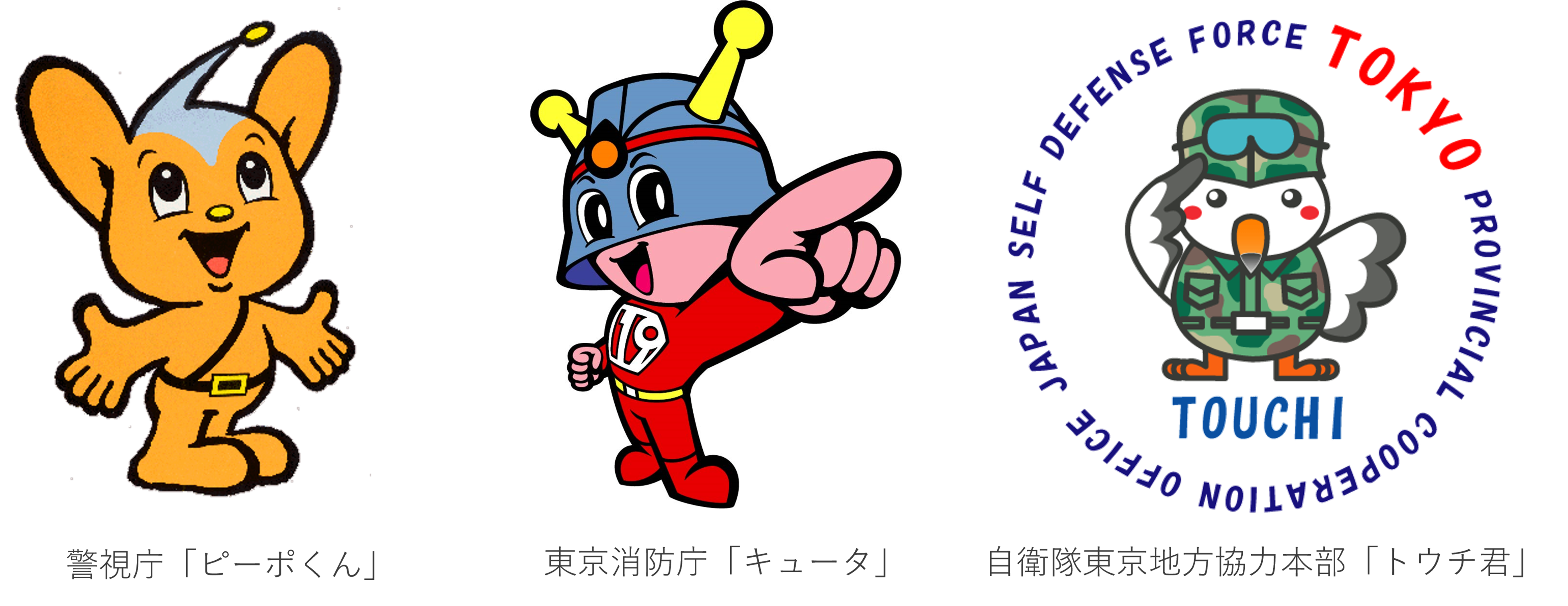 3官庁のマスコットが勢ぞろい! 警視庁「ピーポくん」、東京消防庁「キュータ」、自衛隊東京地方協力本部「トウチ君」が登場します。