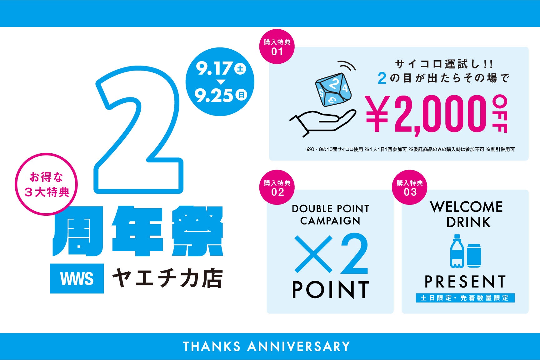 会計時に、WWS公式ストアで使用できるポイントカードに2倍のポイントを付与いたします。