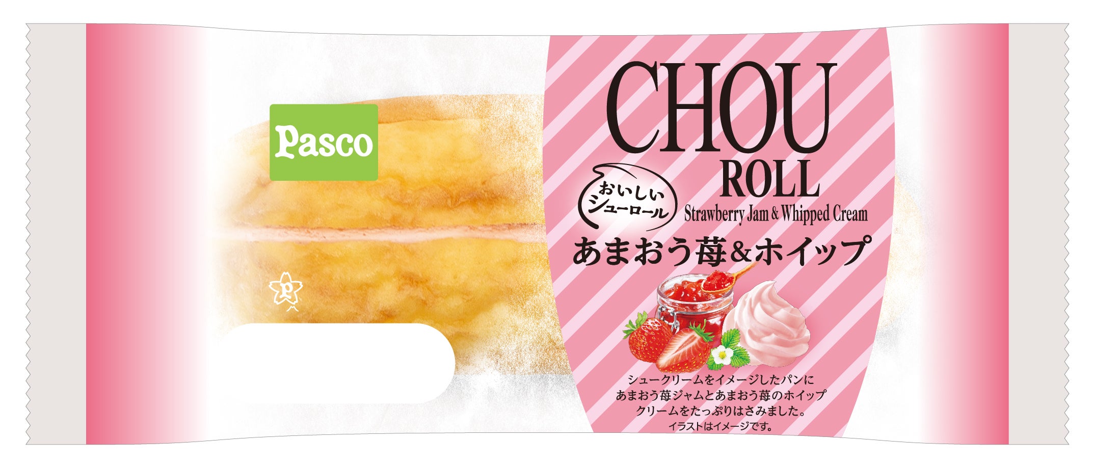 「おいしいシューロール あまおう苺&ホイップ」 は、シュー生地をのせて焼き上げたパンに、あまおう苺のジャムとあまおう苺のホイップクリームをたっぷりはさみました。