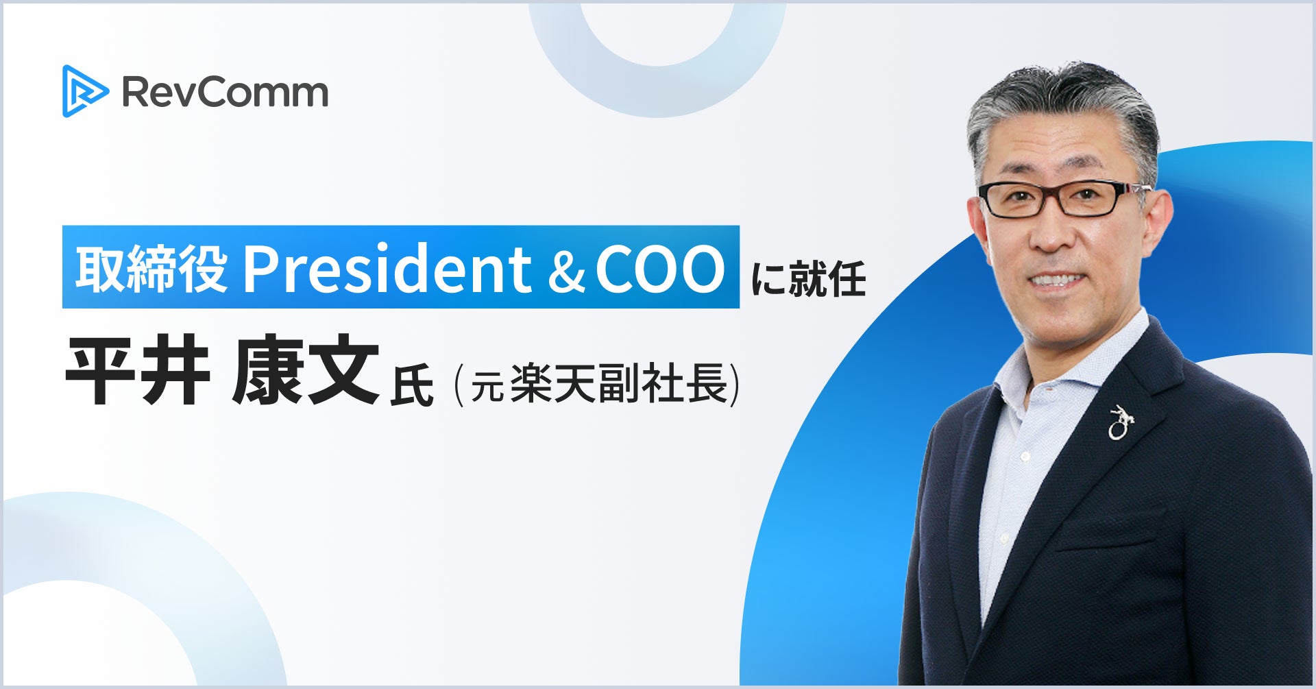 株式会社RevComm(レブコム、本社:東京都渋谷区、代表取締役:會田武史、以下RevComm)は、2025年7月1日の組織改編によりプレジデントならびにCOO(Chief Operating Officer)職を設置し、取締役プレジデント & COO として平井康文(ひらい やすふみ)氏が就任いたしました。