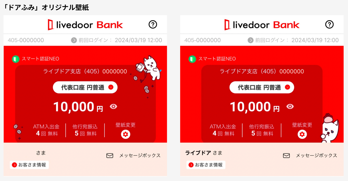 口座開設から日常の銀行取引まで、全ての操作をスマートフォンアプリで完結できるユーザーフレンドリーな設計はもちろんのこと、アプリ内では「みんかぶマガジン」の資産形成に関する記事を閲覧することで、お金に関する知識を学ぶことができます。また、アプリのトップ画面を、ライブドアのキャラクターである「ドアふみ」のオリジナル壁紙に変更することができ、アプリを楽しく利用していただけます。将来的にはイベント参加権のプレゼント等、「貯めて、学んで、楽しむ」銀行サービスを提供していく予定です。