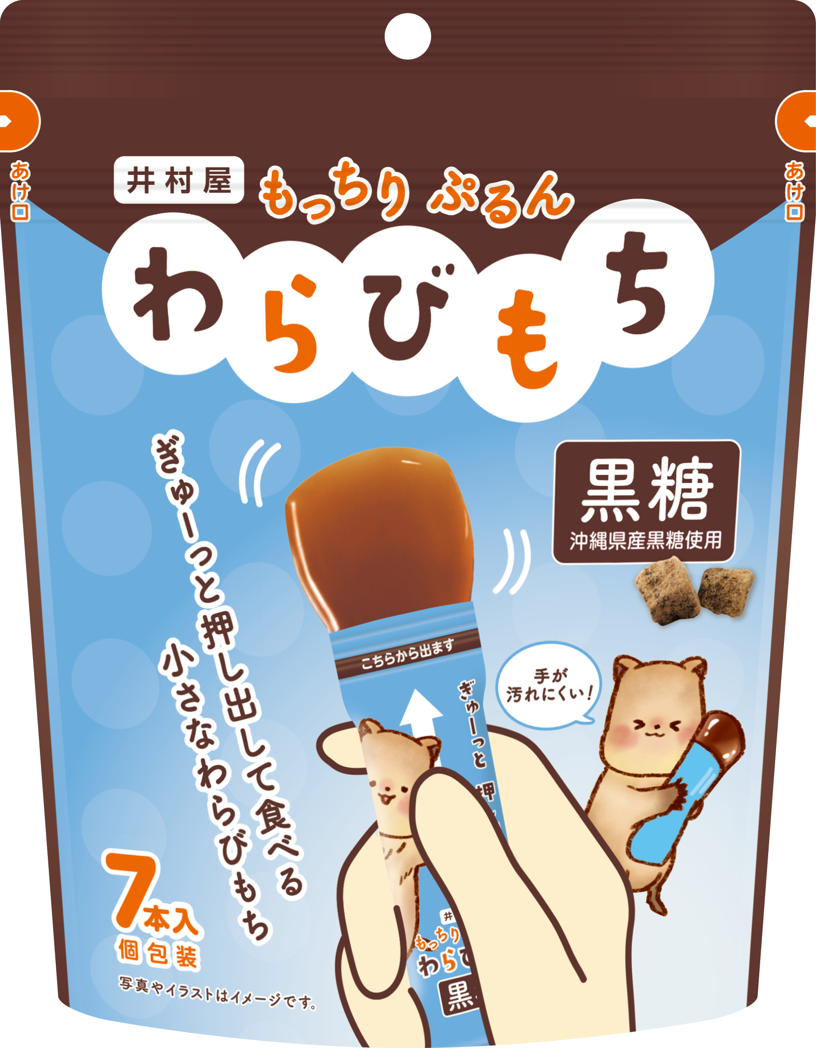 「もっちりぷるんわらびもち」シリーズ(2020年より展開)は、片手で手軽にわらびもちを楽しめるスティックタイプの和菓子シリーズです。「もっちりぷるん」とした食感や風味豊かな味わいに加え、小容量・個包装による利便性、井村屋独自の「ギュッと押すだけパッケージ」による開封性などを評価いただき、さまざまな食シーンでご好評をいただいています。