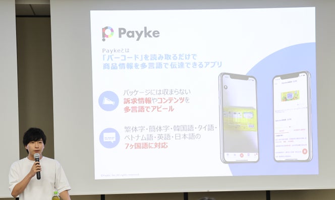 Paykeとは「バーコード」を読み取るだけで商品情報を多⾔語で伝達できるアプリです。パッケージには収まらない訴求情報やコンテンツを多⾔語で伝え、繁体字・簡体字・韓国語・タイ語・ベトナム語・英語・⽇本語の7ヶ国語に対応しています。
