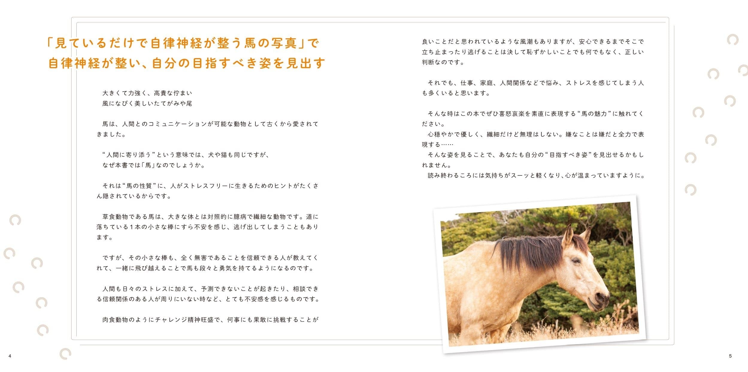さらに写真は自律神経を整える“ヒーリングフォトグラファー”による完全撮り下ろし。馬の構図、風景との調和まで考え抜かれた写真を厳選して掲載します。