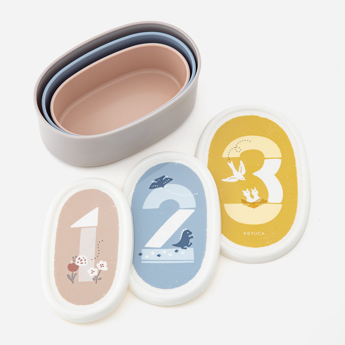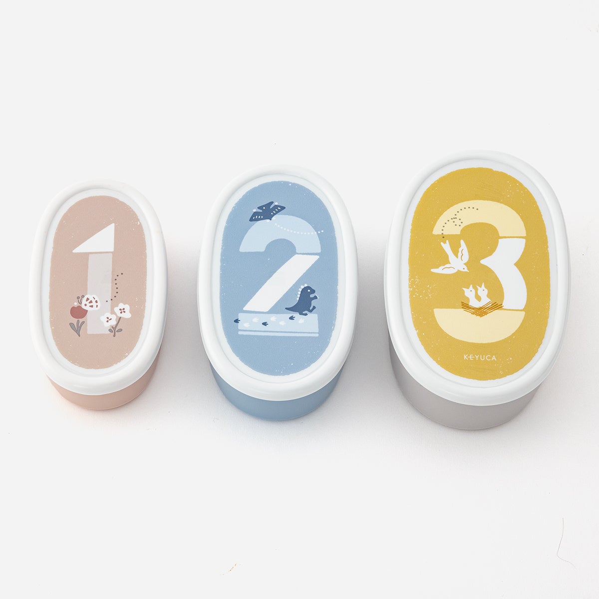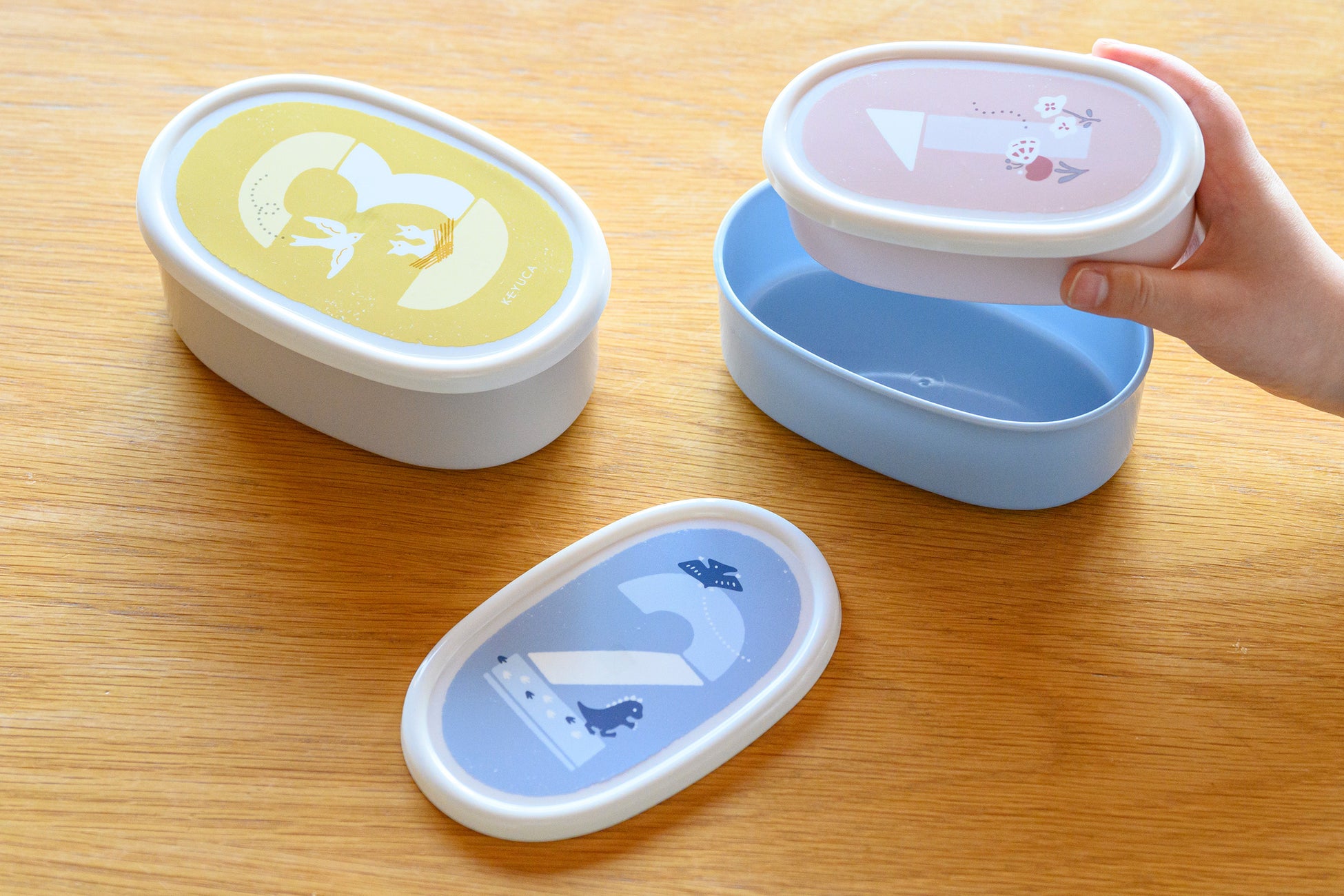今回の「抗菌入れ子容器3点セット」は、「育む」というテーマに合わせて、フタに記載されている1・2・ 3 の数字に合わせてチョウチョが1匹、恐竜が2頭、小鳥が3羽…と、生き物たちが描かれています。容器のサイズに対応した「 1 ・2・3」の数字モチーフ入りのデザインは、「1と 2 を合わせると3にぴったり入るね( 1+2=3) 」「123の順番でしまおうね」など、親も教えやすく、また子どもは数に自然に触れられるため、知育にもおすすめの商品です。