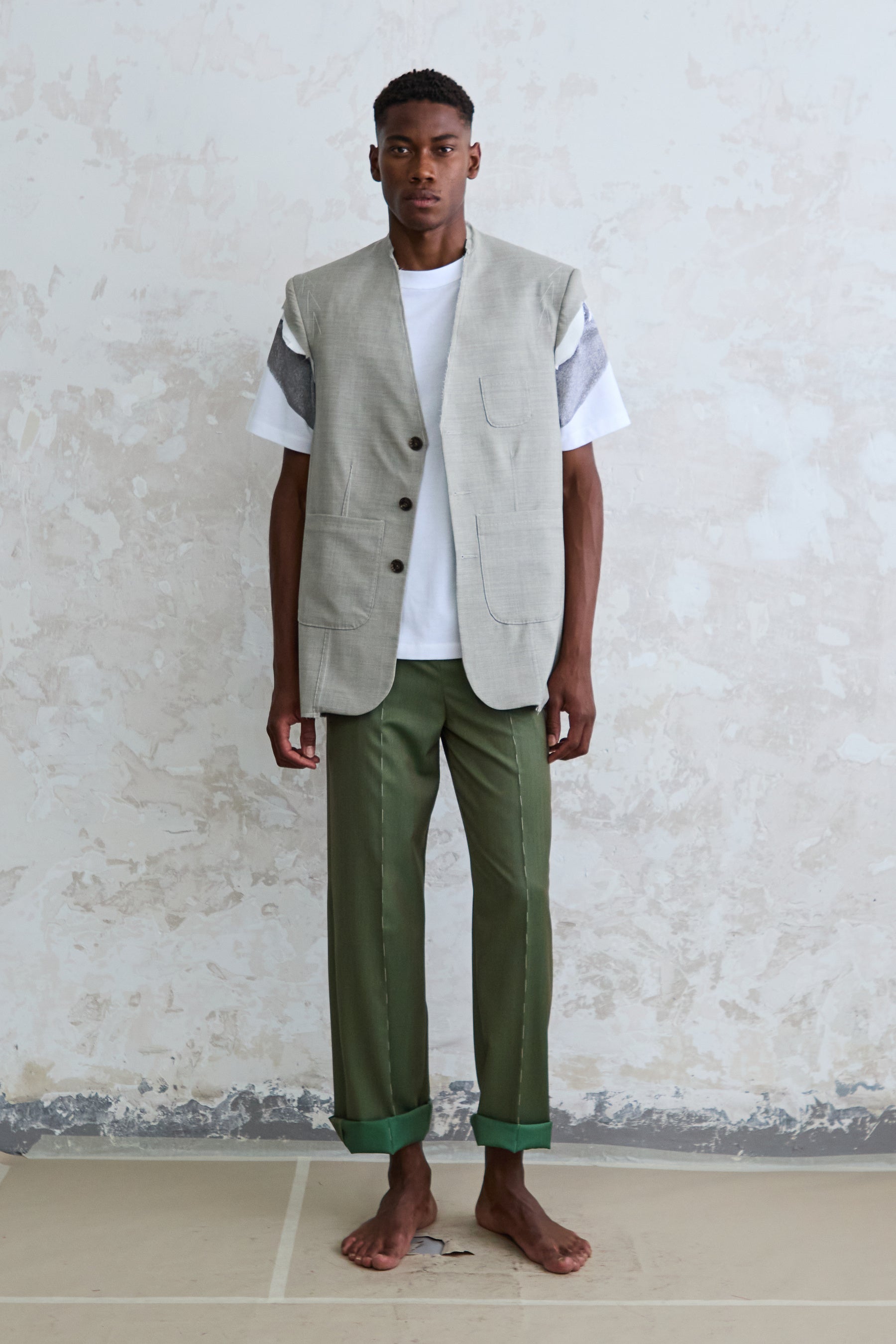 <ソニア カラスコ>は、スペイン・バルセロナで設立された、ユニセックスおよびウィメンズウェアを展開するブランド。構築的かつ実験的なデザインと、クラフツマンシップに根ざしたサステナブルな思想のもと、伝統的なメンズテーラリングにモダンな職人技と工程美をデザインとして表現しているのが特徴です。