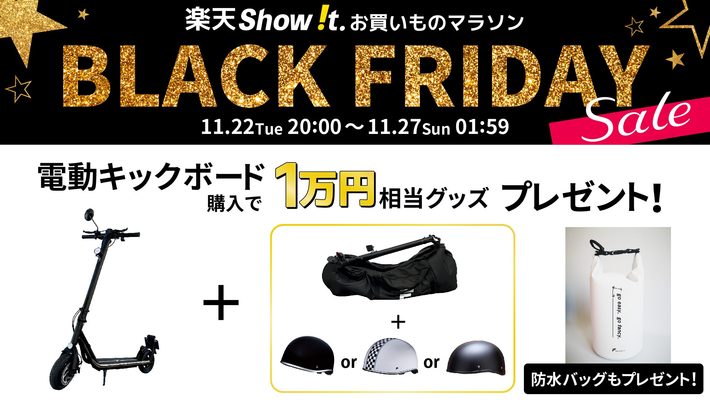 楽天市場「Show !t」ポイント10倍!BLACK FRIDAY SALE開催。11月22日(火)20時、電動キックボードをご購入の方にヘルメット・輪行バックセットのプレゼントキャンペーンを実施。