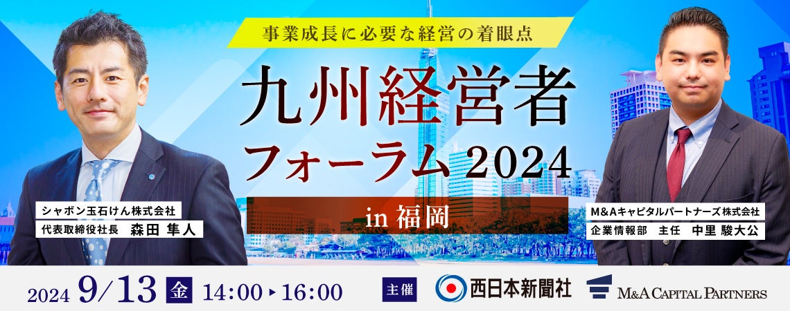M&Aキャピタルパートナーズ株式会社(東京都中央区・代表取締役社長 中村 悟) は、西日本新聞社との共催で、急激な社会の変化に対して、福岡県内の企業が今後どのように 対応していかなければならないのか。事業を成長・発展させるための経営戦略についてお話しさせていただきます。