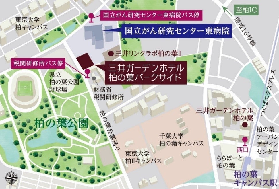 本ホテルは、公・民・学連携で街づくりが推進されている柏の葉スマートシティ内にある、国内有数のがん専門病院・国立がん研究センター東病院(以下、NCC東病院)の敷地内に立地し病院と隣接していることで、がん患者さんと付き添いご家族の利便性の向上を図ることができます。また、柏の葉スマートシティで形成を進めるライフサイエンス拠点の中核であり、新たな診療モデル創出の場としての活用も期待され、創薬や医療機器の研究・開発に繋げ、柏の葉から最先端医療創出に寄与してまいります。