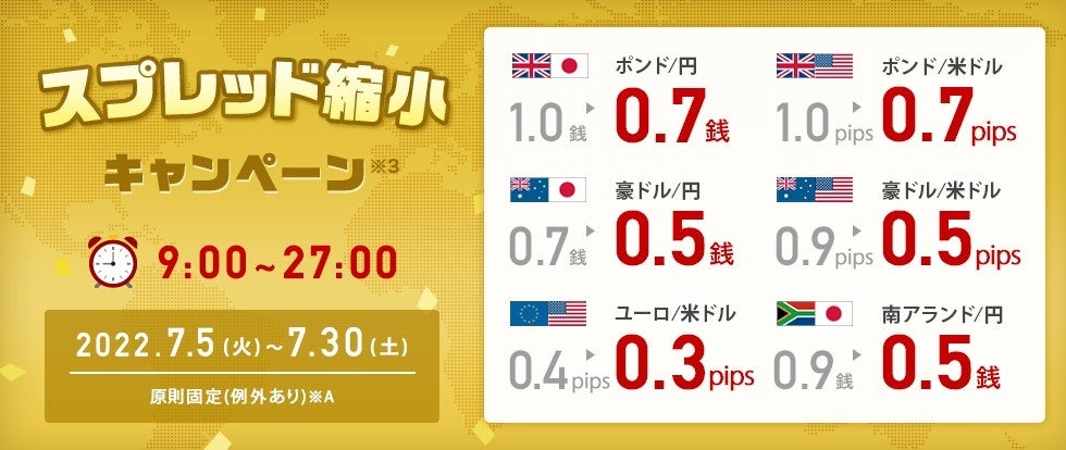 ※3 「提示時間帯拡大!スプレッド縮小キャンペーン」スプレッド(対象期間:2022年7月5日(月)午前9時00分~2022年7月30日(土)午前3時00分、提示時間帯:対象期間中の各営業日午前9時~翌午前3時)