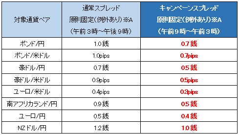 ※キャンペーンスプレッドの提示時間帯はすべて対象期間中の各営業日の午前9時~翌午前3時。同期間中の通常スプレッドは各営業日の午前3時~午前9時に提示。