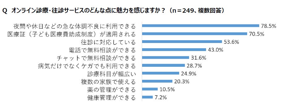 子どもの体調不良の場合に利用できる「オンライン診療・往診サービス」(アプリ・Webなどで登録し、医者によるオンライン診察や往診を受けられるサービス)を「知っている」と回答した人は69.6%。そのうち、「興味がある」と回答した人は83.1%にのぼります。どういった点に魅力を感じるかについて最も多かったのは「夜間や休日などの急な体調不良に利用ができる」で78.5%、次に「医療証が適用される」で70.5%となり、「万一のときに利用できる」安心感と費用が高評価につながっているようです。