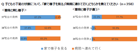 未就学児の⼦どもがいるママ・パパ(有効回答数358)に、子どもの状態(発熱の度合い/普段の様子との違い)で「家で様子を見る」「病院に連れて行く」どちらの判断をするかを聞きました。発熱がないときは、「普段と様子が違う」と「病院に連れて行く」人は9.8%、一方「具体的に体の不調を訴えている」場合は50.3%と約半数のママが「病院に連れて行く」と回答しました。発熱した場合は、下記グラフの結果となり、多くのママにとって、子どもの様子が普段と違うことが、「病院に連れて行く」判断の軸にあるようです。