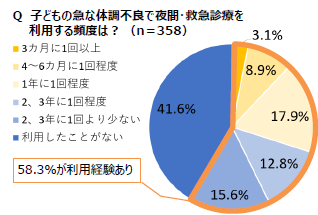 休日・夜間の子どもの急な体調不良などで、小児科医師・看護師に電話で相談できる「#8000」(子ども医療電話相談)。利用したこのある人は52.8%で、その頻度を聞いたところ、 6カ月に1回以上が9.2%、1年に1回程度が16.5%でした。また、夜間・救急診療の利用については下のグラフの通り。約6割の人は利用経験があり、1年に1回程度利用する人が最も多く17.9%でした。