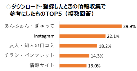 「オンライン診療・往診サービス」をダウンロード・登録した際に情報収集として参考にしたものを聞いたところ、トップはこどもりびんぐ発行の「あんふぁん」「ぎゅって」。ママ・パパ世代が内容にきちんと目を通し読んでいることが分かります。
