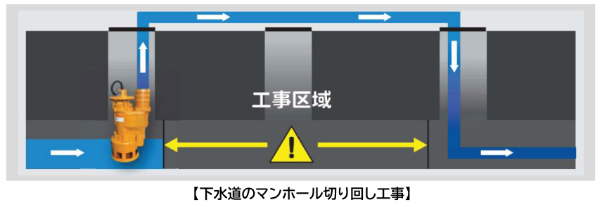 現在、国内インフラの老朽化にともない、下水道の更新工事や改修工事は年々増加しています。こうした工事では、施工区間に下水が流れ込まないようにする必要があり、下水を迂回させる「切り回し」作業が必要になります。汚水用の水中ポンプは機械の構造上、一般的な下水道のマンホール(開口部内径600mmの1号マンホール)に入らないものが多く、これまでは通過粒径が小さい汎用的な水中ポンプで代用していましたが、異物の多い下水では異物混入による詰まりがトラブルの大きな原因となっていました。