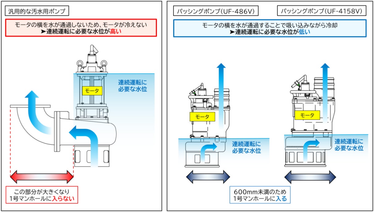 ②水位が低くても排水の流れでモータを冷却する独自の「片水路構造」により連続運転が可能