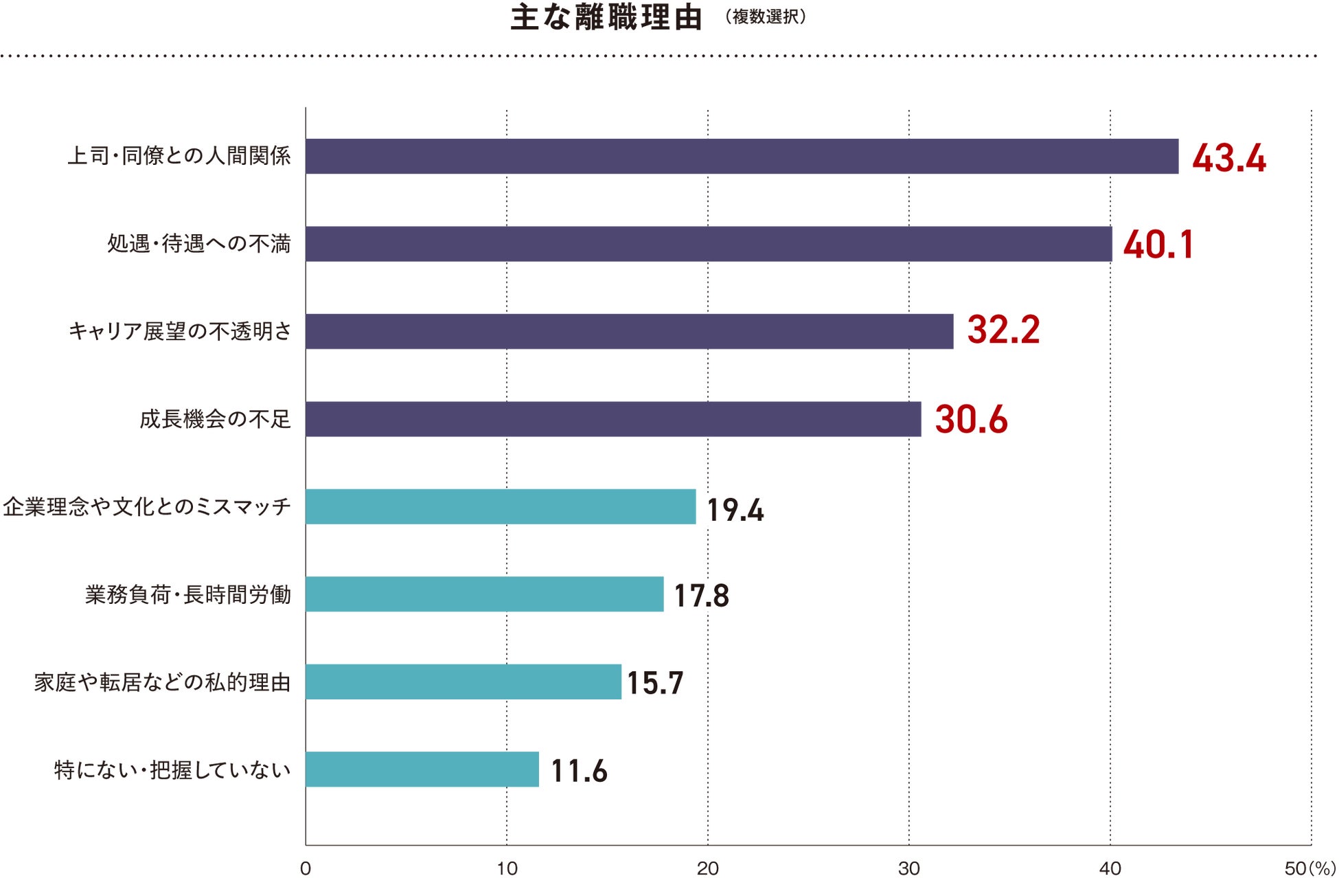 (7)離職理由の上位は「人間関係」「処遇・待遇への不満」、将来性や自己実現も重視。