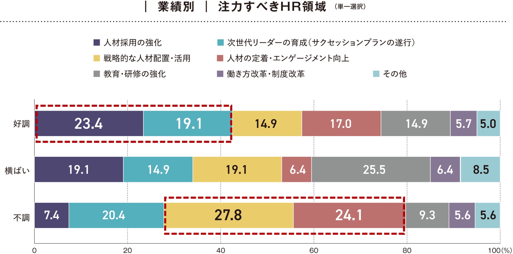 (1) 業績状況によって「注力すべきHR戦略領域」が大きく異なる結果に。業績が不調な企業では「戦略的な人材配置・活用」や「人材の定着・エンゲージメント向上」、業績が好調な企業では「人材採用の強化」や「次世代リーダーの育成」が重視されています。