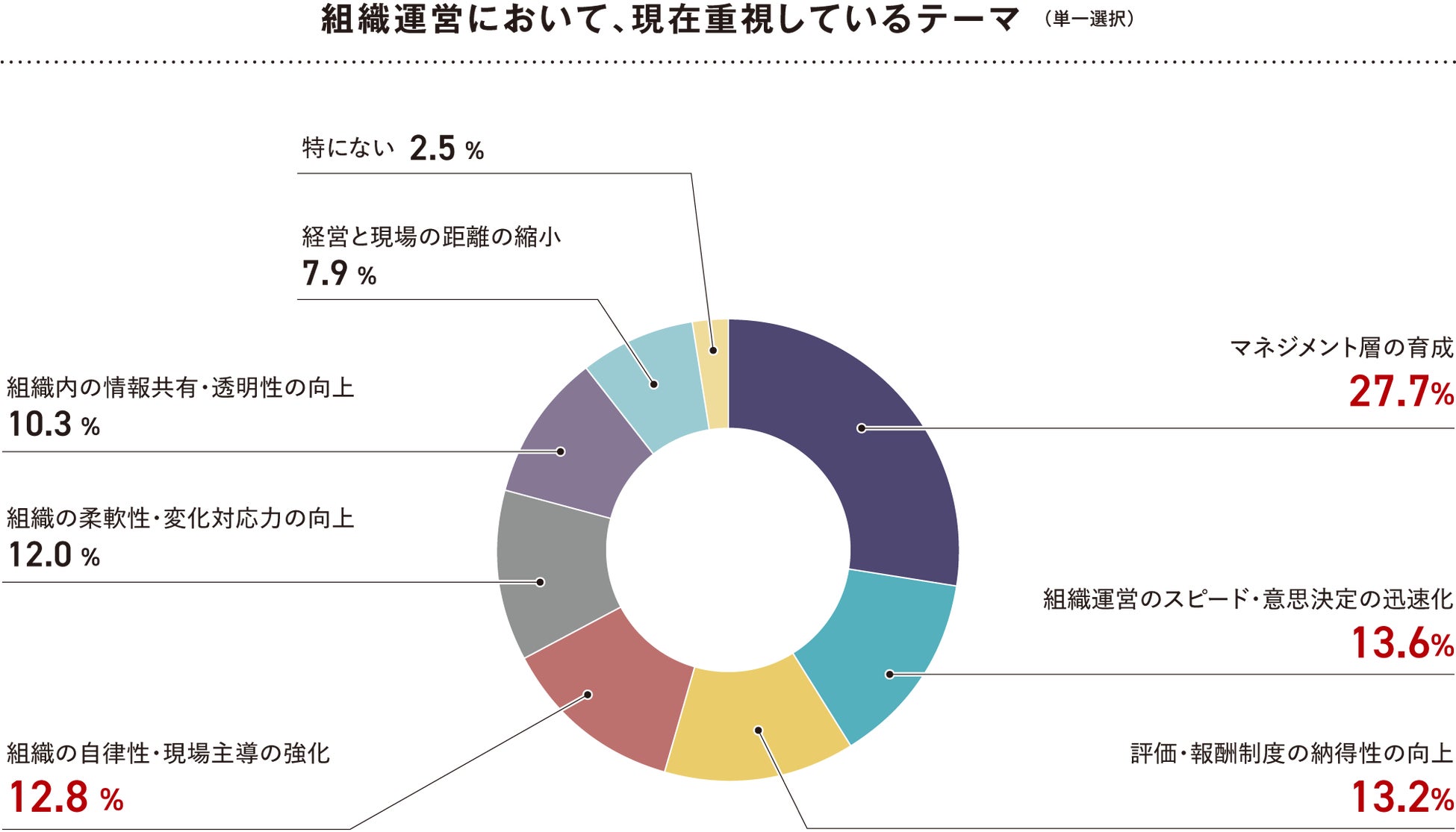 現在重視している組織運営テーマとして最も多く挙げられたのは「マネジメント層の育成」(27.7%)でした。次いで、「組織運営のスピード・意思決定の迅速化」(13.6%)、「評価・報酬制度の納得性の向上」(13.2%)、「組織の自律性・現場主義の強化」(12.8%)が続きます。各企業において、マネジメント層の強化を通じて経営基盤の再構築を目指す意識が高いことがうかがえます。