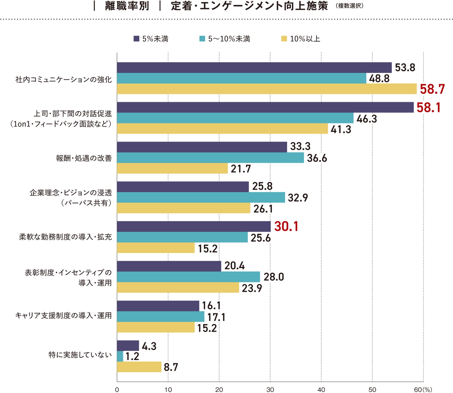 一方、離職率が10%以上の企業では「社内コミュニケーションの強化」(58.7%)に偏っており、「報酬・処遇の改善」や「柔軟な勤務制度の導入・拡充」が相対的に低い傾向が見られました。対話に加えて制度面の対応も重要なポイントとなりそうです。