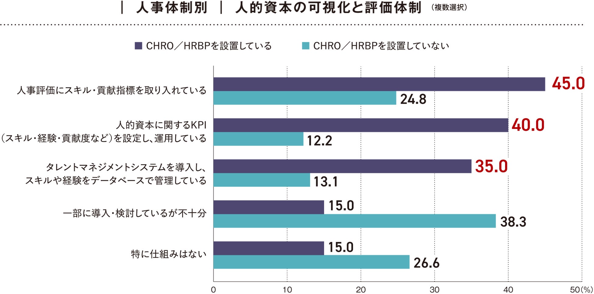 (2) 人事体制別に人的資本の可視化・評価の取り組み状況を比較したところ、CHRO(最高人事責任者)やHRBP(HRビジネスパートナー)を設置している企業において、「スキル・貢献指標の評価」や「人的資本KPIの設定・運用」、「タレントマネジメントシステムの導入」のいずれも高水準であることが分かりました。