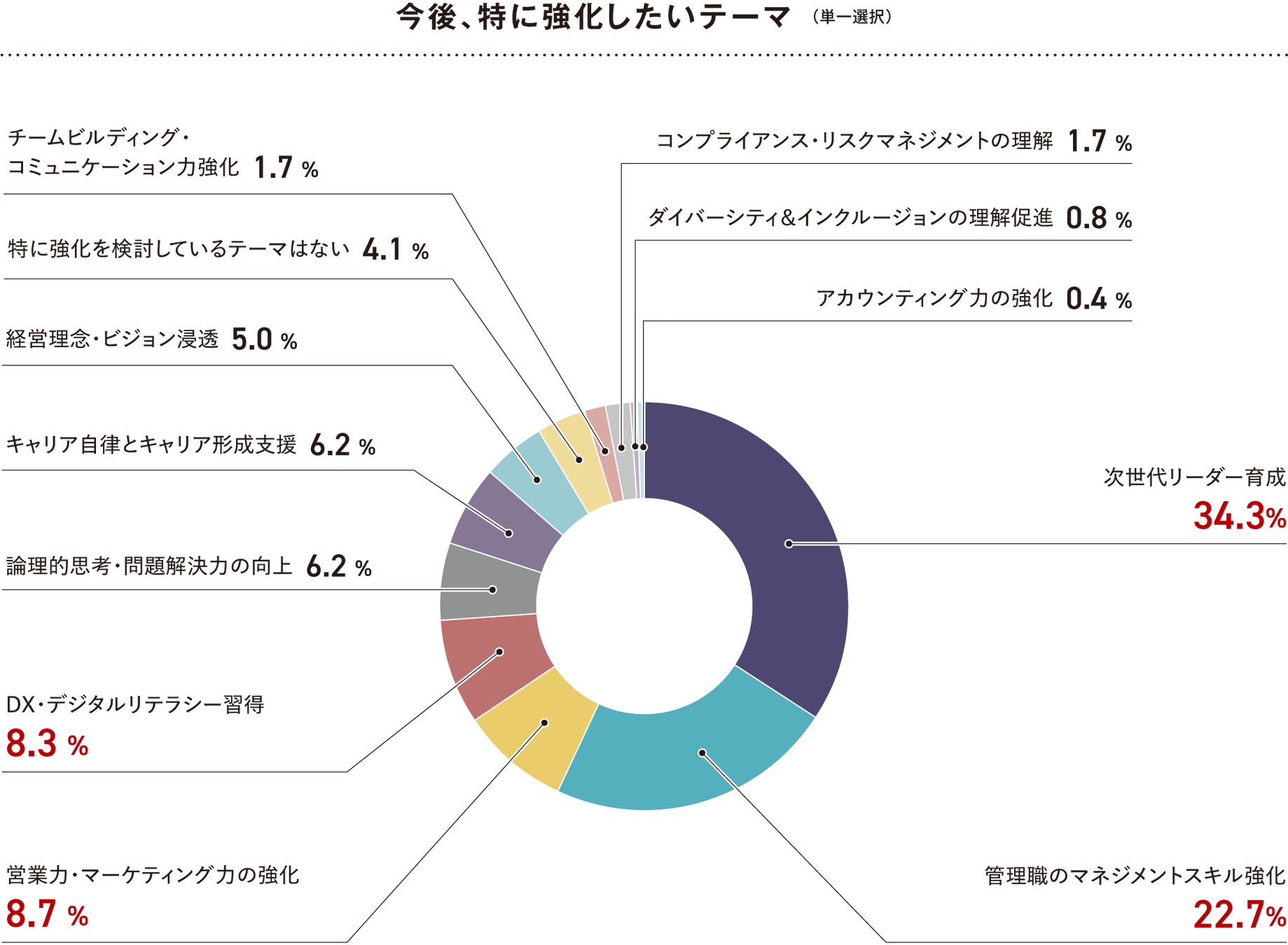 今後、特に強化したいテーマを問う設問では、「次世代リーダー育成」(34.3%)と「管理職のマネジメントスキル強化」(22.7%)が上位を占めました。実務経験を積んだ層に対して、マネジメント力や将来の組織運営を担う力を高める意識が強まっていることが分かります。加えて、「営業力・マーケティング力の強化」(8.7%)や「DX・デジタルリテラシー習得」(8.3%)も一定の関心を集めていることから、経営と現場の両面で推進力を担う人材づくりが今後の鍵となりそうです。