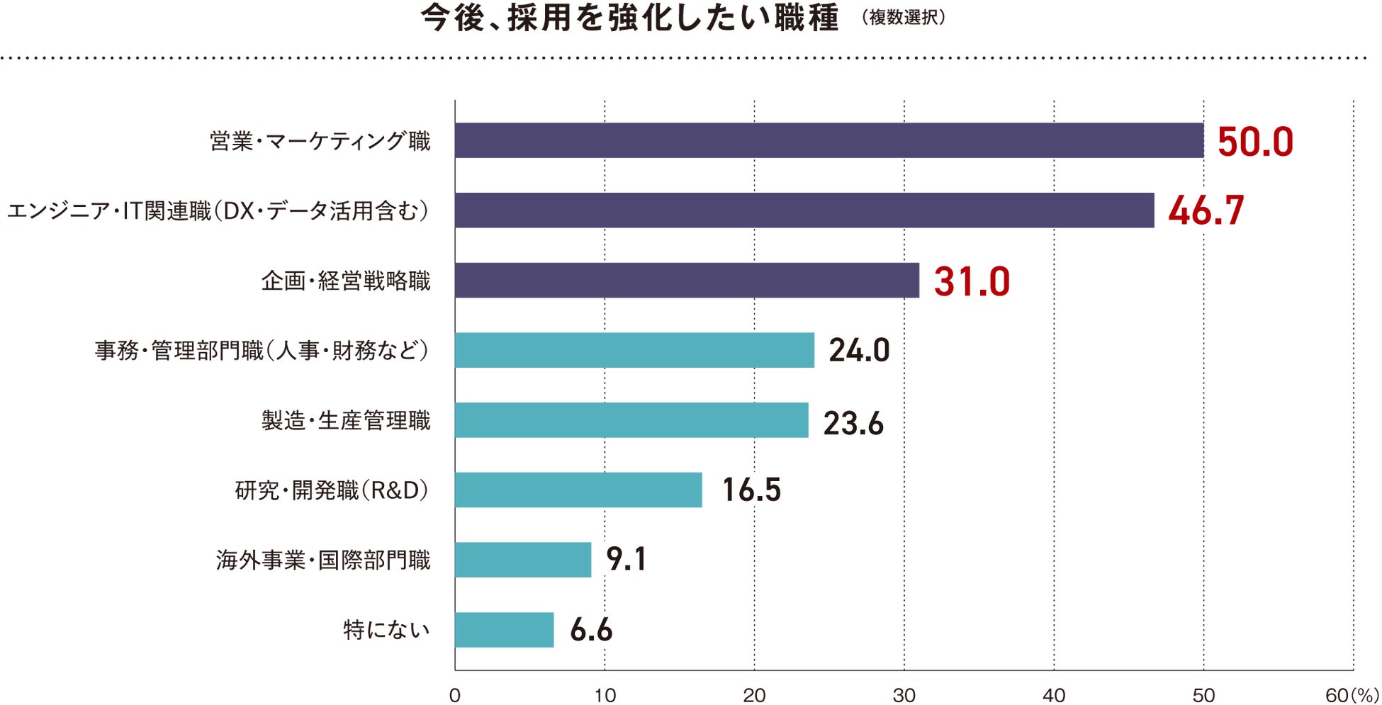 今後採用を強化したい職種としては、「営業・マーケティング職」(50.0%)が最多となり、次いで「エンジニア・IT関連職(DX・データ活用含む)」(46.7%)が高い割合を示しました。また、「企画・経営戦略職」(31.0%)も3割を超えております。一方、「事務・管理部門職」や「製造・生産管理職」は2割台にとどまっていることから、フロント機能や成長ドライバーとなる職種への重点採用が進められていることがうかがえます。