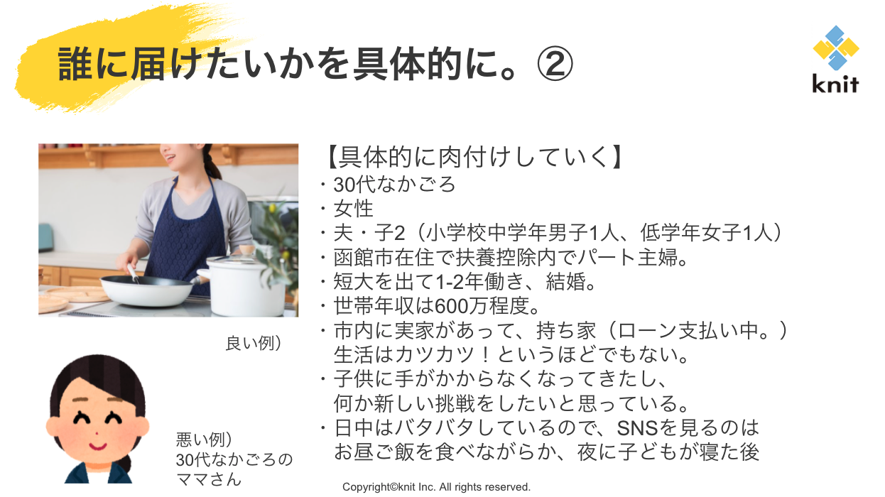 また、情報を届けたい相手=ターゲットを明確にすることも欠かせません。年齢や性別、子どもの有無、年収、趣味、服装など、できるだけ具体的に考えることがポイントです。よりターゲットに刺さりやすいコンテンツ制作に役立ちます。