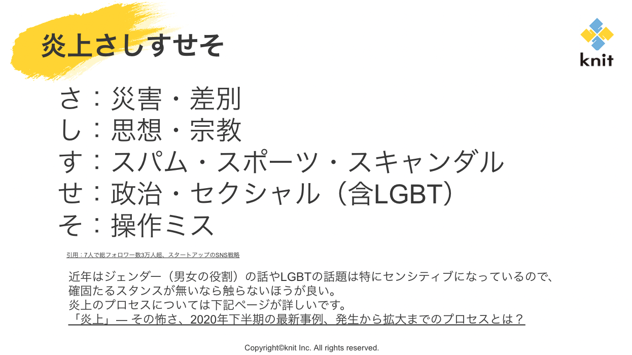 炎上リスクの高い話題はできるだけ避けましょう。以下は、炎上する可能性が高いとされる「炎上さしすせそ」です。