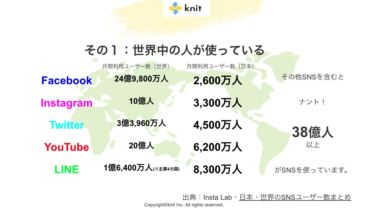 今、世界ではどれくらいの人がSNSを利用しているのか、その規模と影響度を説明するために、FacebookやInstagram、Twitterなどのユーザー数を紹介しました。現在、約38億人がSNSを利用していると言われています。