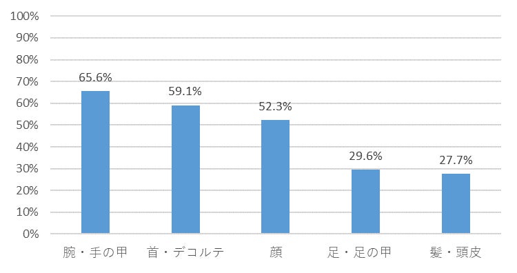 使用する部位は「腕・手の甲」「首・デコルテ」「顔」といった顔や身体中心で、加えて「足の甲」や「髪・頭皮」の塗りにくい箇所まで全身に使われています。